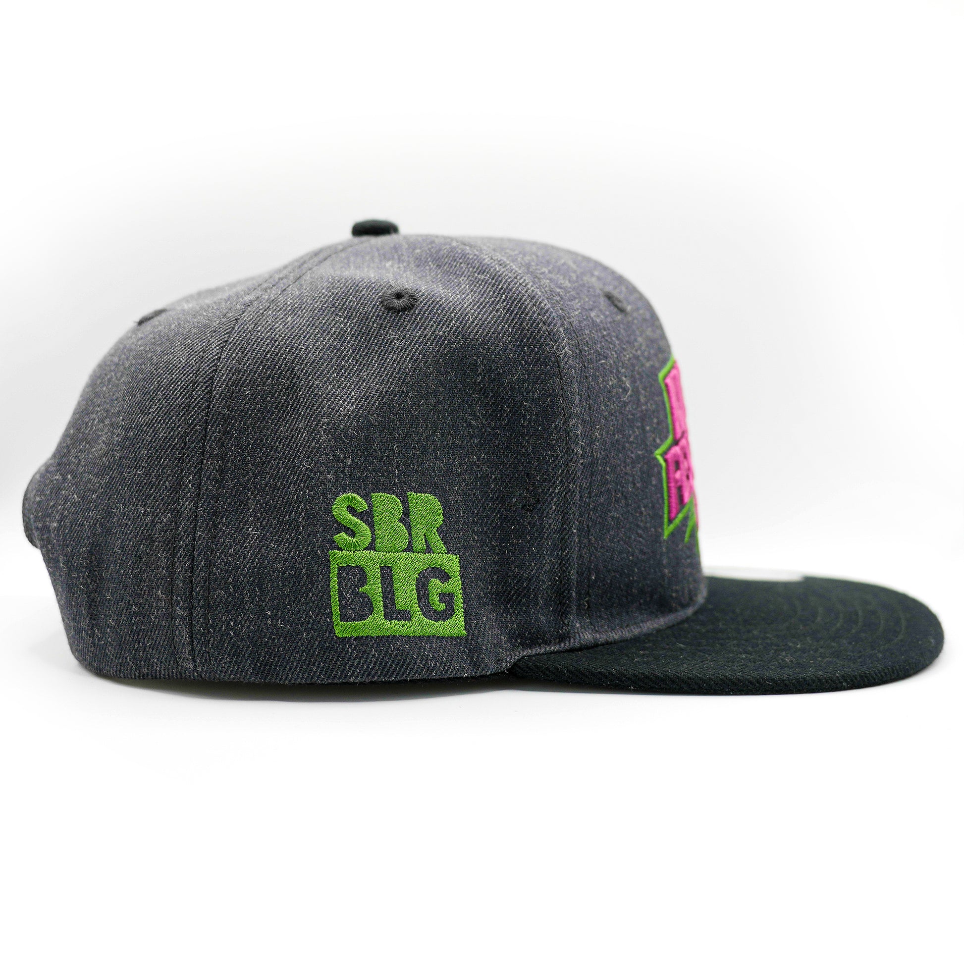 Seiten-Optik: linke Seite mit dezentem Schlagschrauber-Symbol in Pink und rechte Seite mit SBRBLG-Schriftzug in Neongrün. Zusätzliche Details in Form eines SBRBLG-Holo-Stickers und Cap-Innenband.