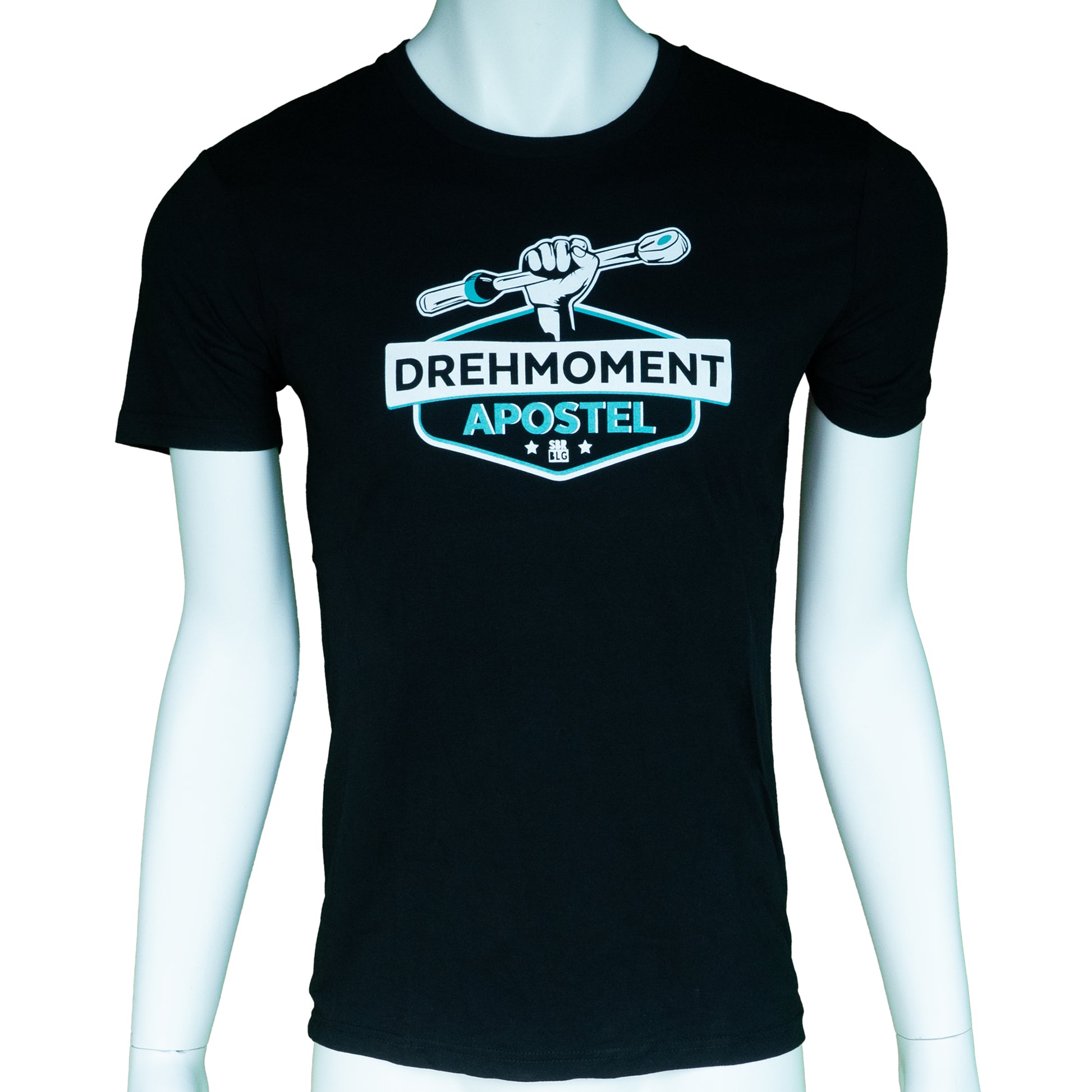 Unisex T-Shirt mit großem "DREHMOMENTAPOSTEL" Frontprint in schwarz.
